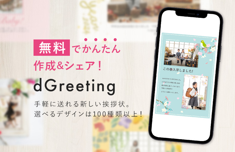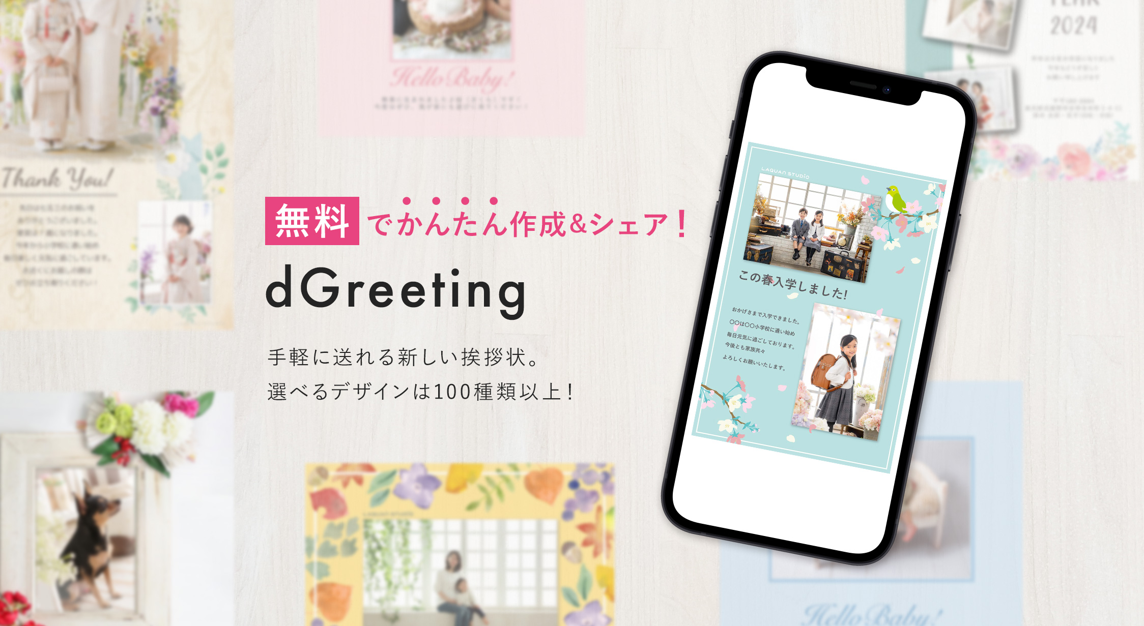 dGreetingは、らかんスタジオで撮影した写真やご自身で撮影したスマホ画像で、オンラインのグリーティングカードを作成できるサービスです。結婚報告、出産報告など、家族や友人に気軽に送信できます!